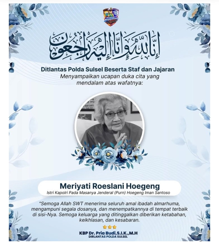 TOPsul. Makassar — Direktorat Lalu Lintas Polda Sulawesi Selatan menyampaikan duka cita mendalam atas wafatnya Meriyati Roeslani Hoegeng, istri dari Hoegeng Imam Santoso, sosok legendaris Polri yang dikenal luas karena integritas dan keteladanannya.