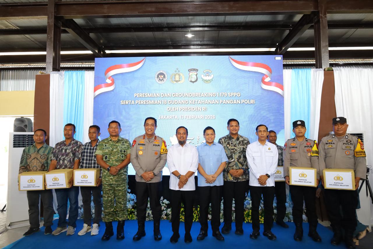 TOPsul. Bantaeng – Kepala Kepolisian Daerah Sulawesi Selatan, Djuhandhani Rahardjo Puro, mengikuti peresmian dan peletakan batu pertama Satuan Pelayanan Pemenuhan Gizi (SPPG) Polri serta peresmian Gudang Ketahanan Pangan Polri secara virtual dari Gudang Ketahanan Pangan Polres Bantaeng, Jumat (13/02/2026).
