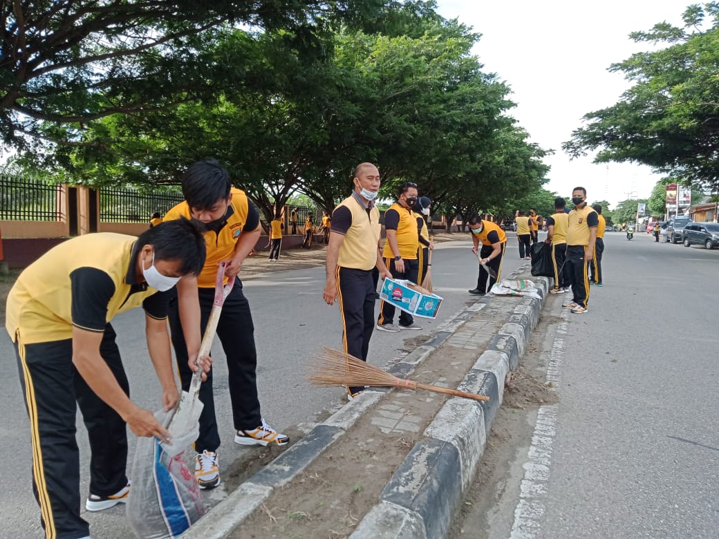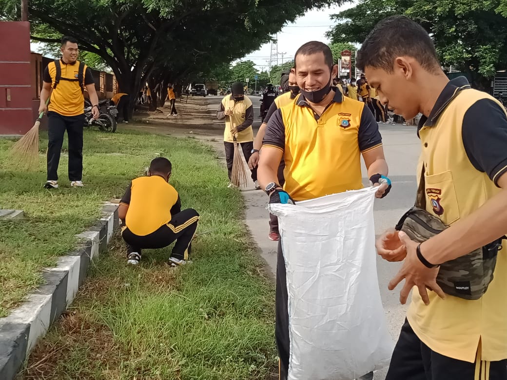Info Palu, Ada yang berbeda di Jalan Soekarno Hatta Palu sejak pagi 06.30 wita, dimana ratusan personil Polri berseragam training olah raga kuning hitam melaksanakan kerja bakti, Jumat (13/8/2021)